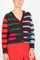 This wide button-up cardigan is made from a soft cashmere knit, featuring a vibrant colourful stripe print throughout. It boasts a four-button closure and includes two patch pockets at the front. The design is completed with a wide, fine ribbed hem and ribbed cuffs, all crafted from 100% cashmere.