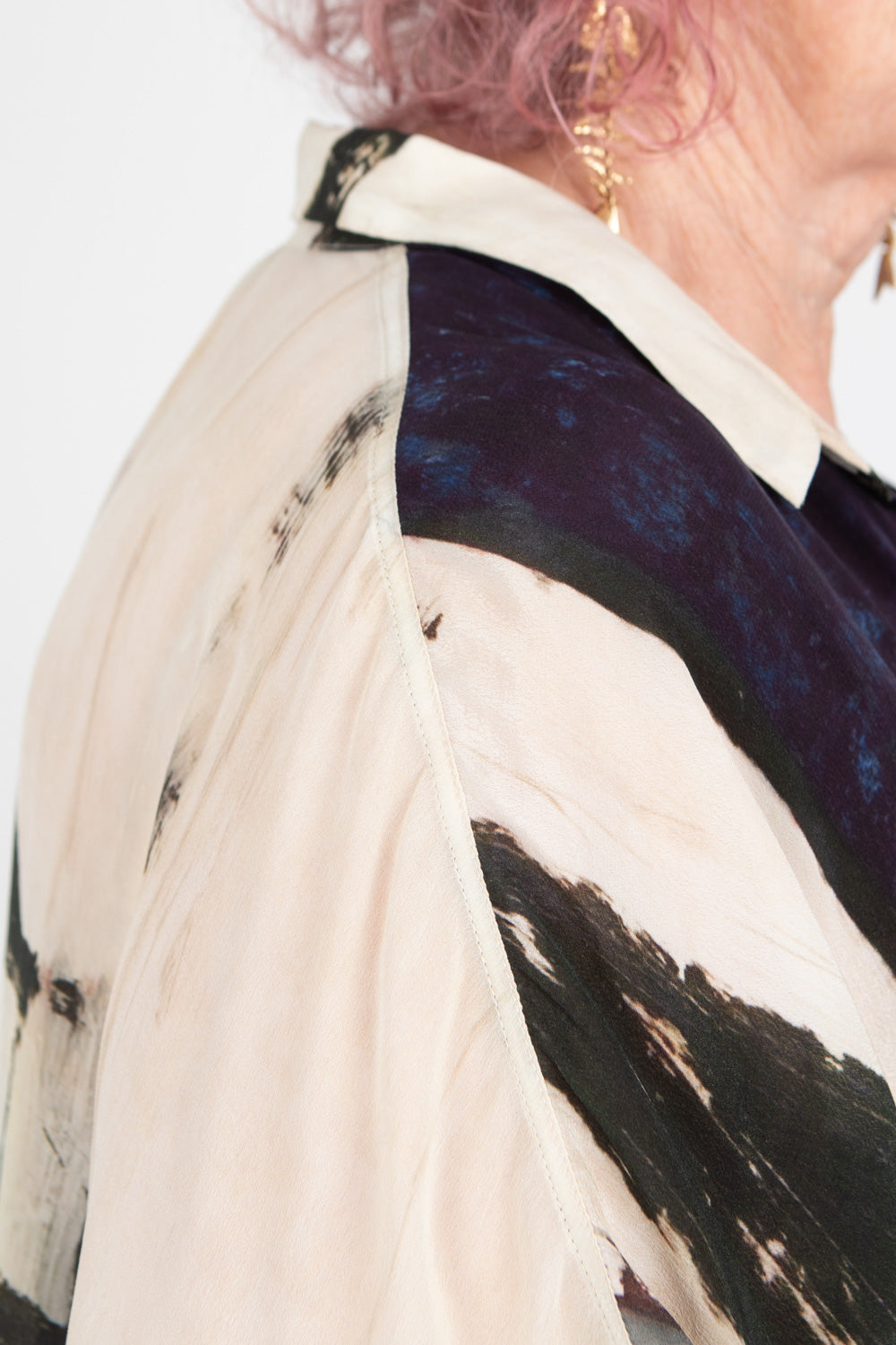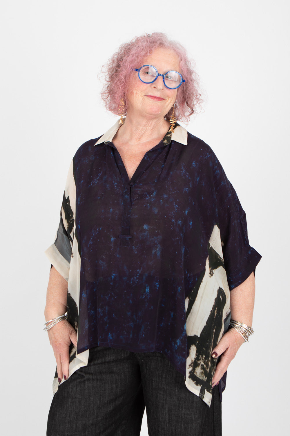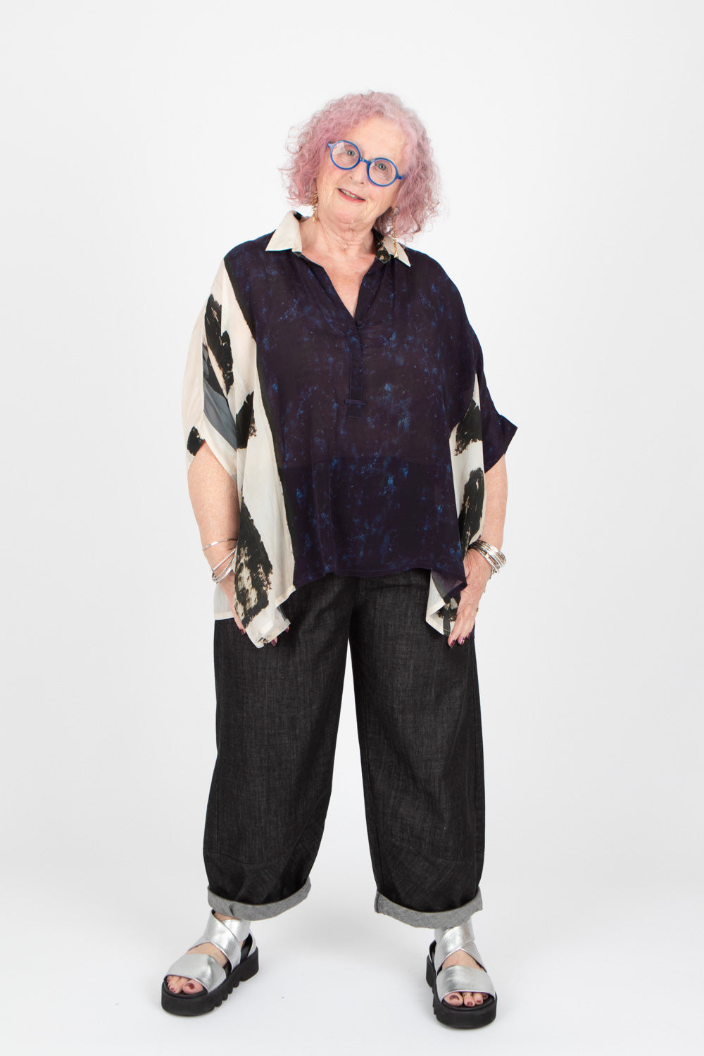 This striking top, is so easy to style, the black and white print mixed with the mottled blues means this will style, with almost anything. Wear as an extra layer over a dress, pair with jeans or your favourite trouser. The open v neckline is flattering, and can be layered with a pullover in the cooler evenings.