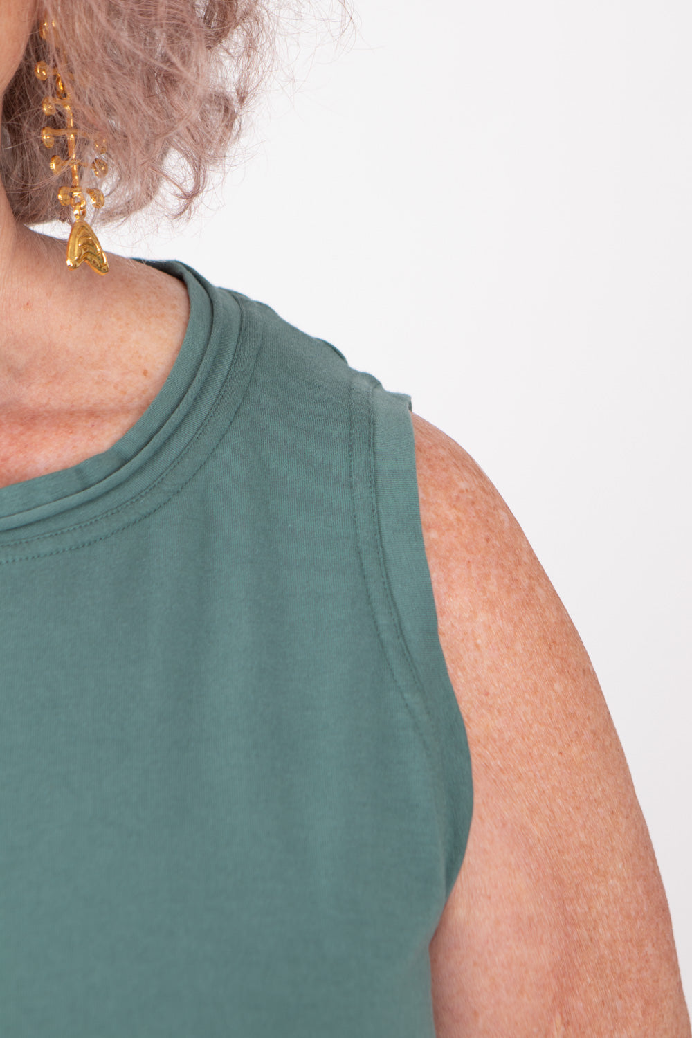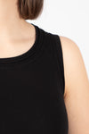 Crafted from an ultra-soft and stretchy cotton jersey, this Rundholz sleeveless vest top prioritizes both comfort and a modern, tactile aesthetic. It features a sophisticated high neckline that balances the contemporary edge of its exposed side seams. The design is finished with a unique doubled curled hem, adding a relaxed, textural dimension to the silhouette