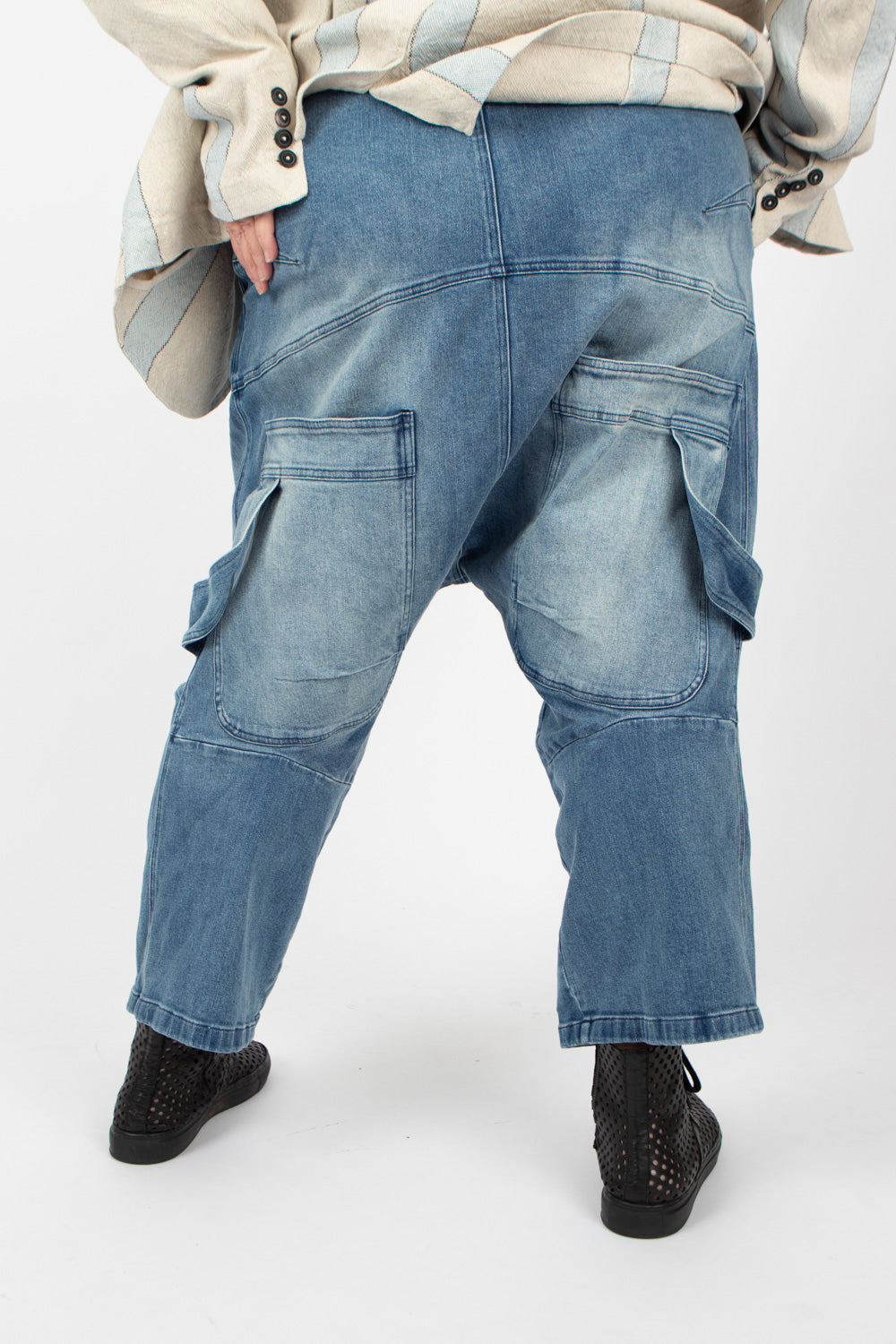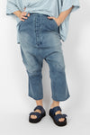 These Rundholz cropped drop-crotch jeans are crafted from premium denim with a contemporary, relaxed silhouette. Featuring a signature button fly fastening and sturdy belt loops, the design is defined by structural darts at the knee for added shape The functional layout includes two inset side pockets and two oversized patch pockets on the reverse for a bold, utilitarian finish