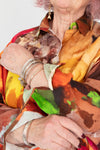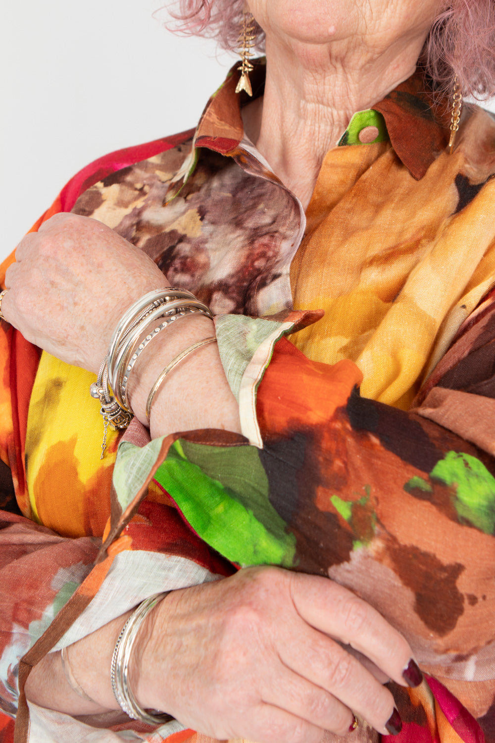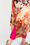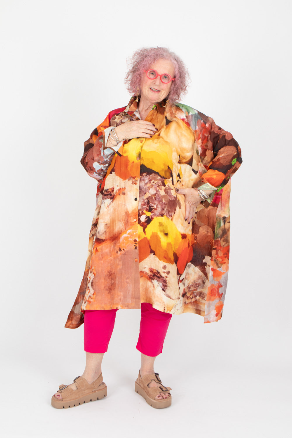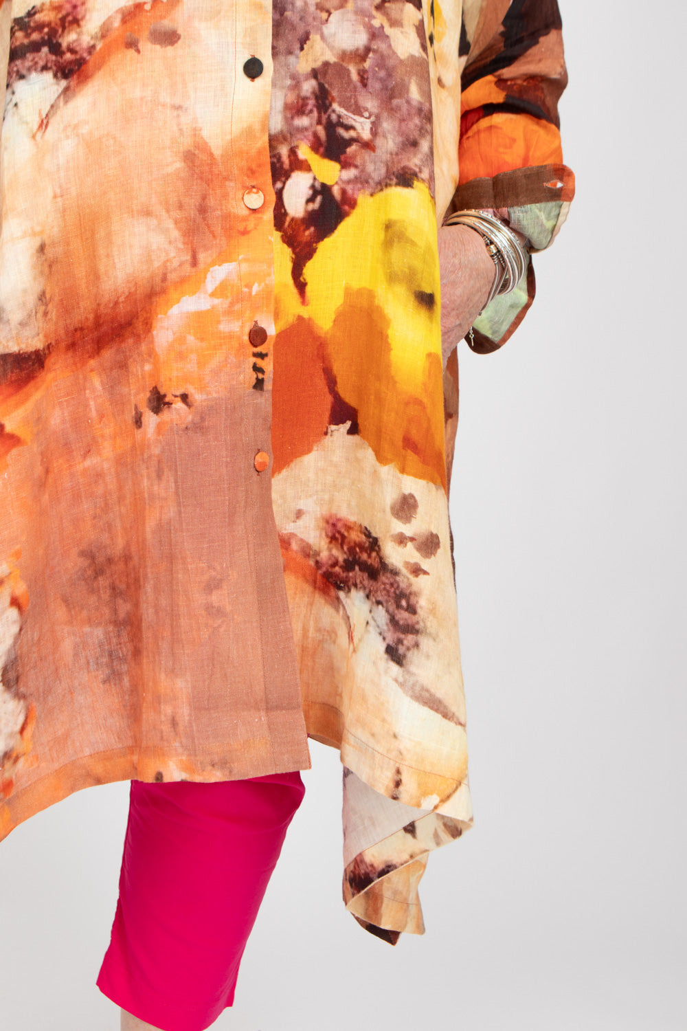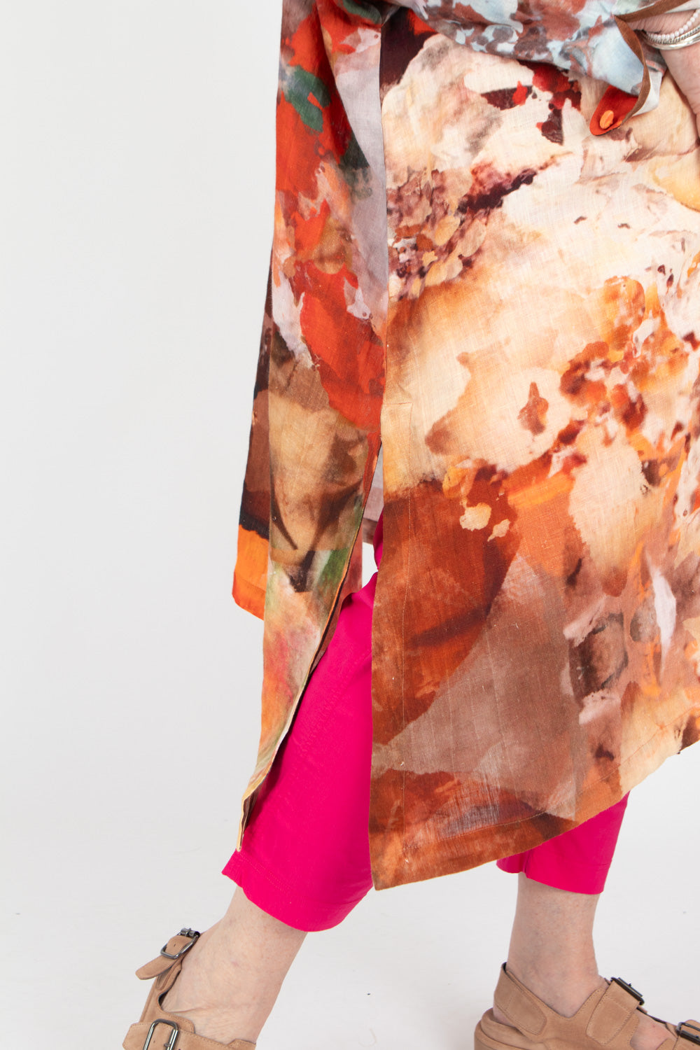 So many fabulous colours in the linen shirt dress, the bold abstract still life painting is really eye catching without being obvious. Layer up in spring or wear as a light weight coat.