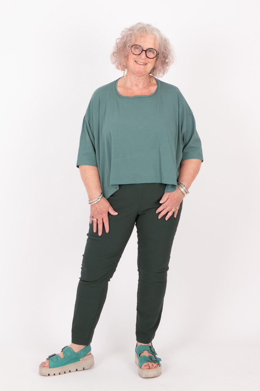 A customer favourite for a reason! These slim trousers are the perfect trouser to wear under oversized tops & tunics. This fabric is slightly thicker which we find more flattering in this fitted style.