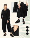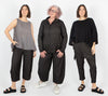 This fabric is available in a wide leg trouser, barrel leg trouser, bubble skirt and jacket.