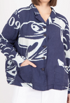 Loose-fit linen jacket with a button-up front, classic collar, and full-length sleeves with button cuffs. Features two front patch pockets.