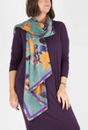 100% silk scarf featuring floral prints on a teal background. Sized 100 x 100 cm.