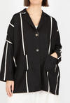 Boxy, loose-fit jacket with dropped shoulders, a neat collar, and button-up front. Features front patch pockets and is crafted from a unique striped fabric for a relaxed yet refined look.