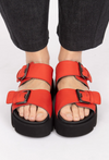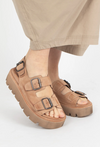 Two-strap sandals with wide leather straps, chunky adjustable buckles, and a contoured padded footbed. Finished with a lightweight black rubber sole.