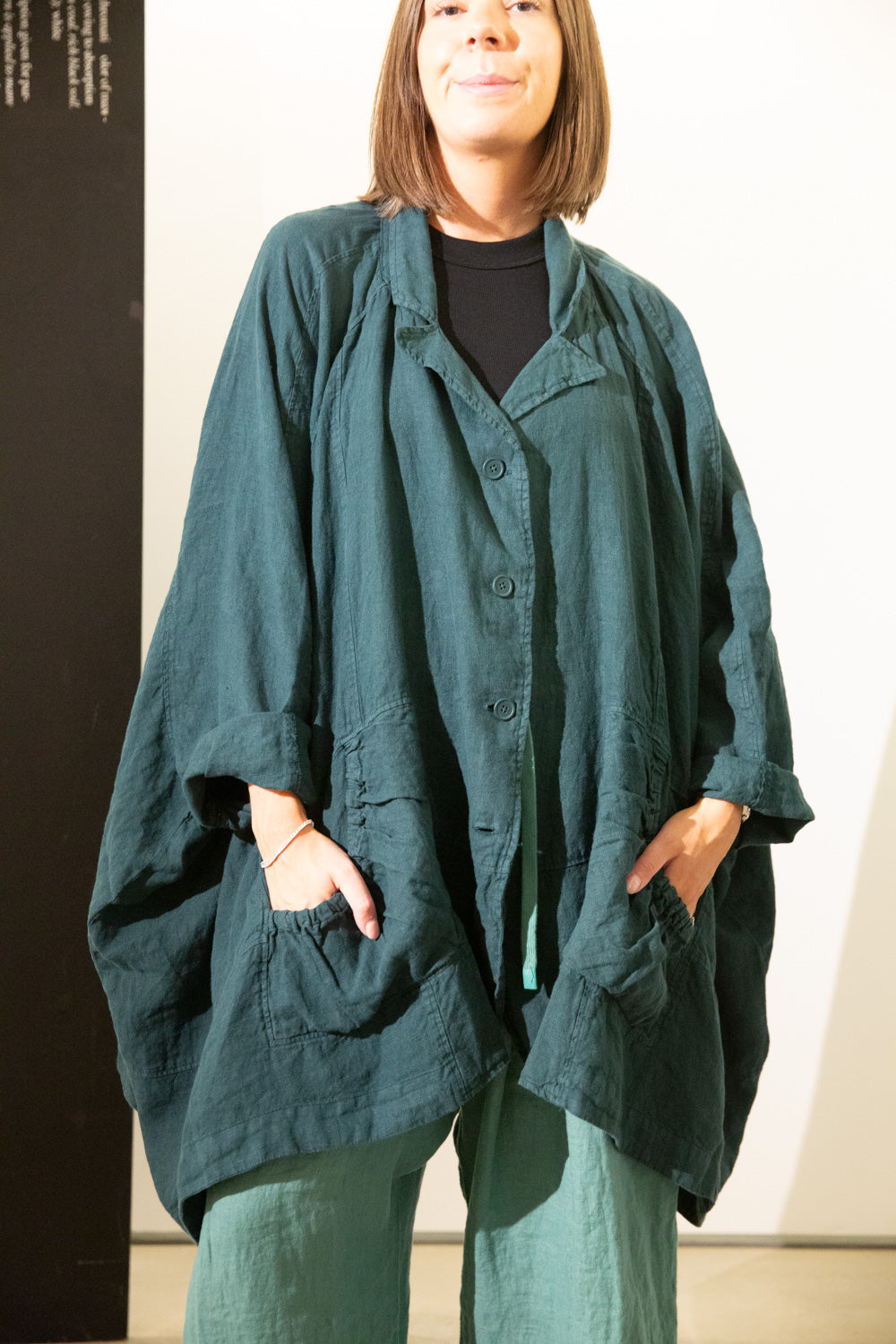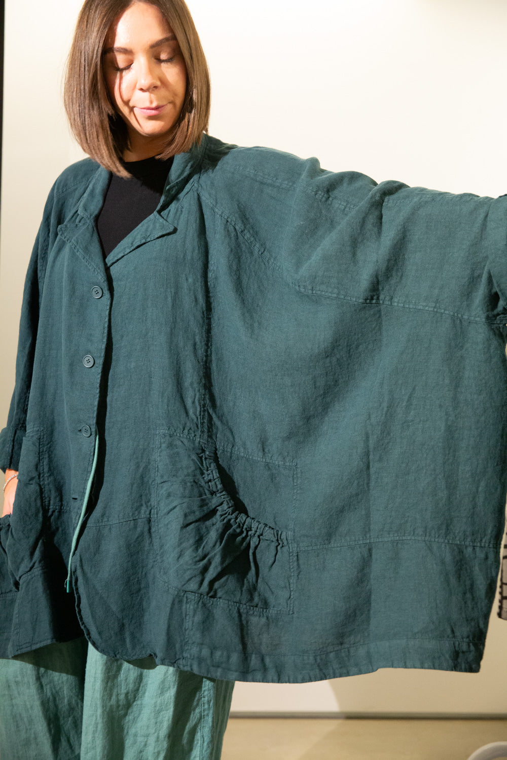 Effortless volume meets artisanal charm in this one-size essential. Crafted from super-soft, high-quality linen that drapes beautifully, this Rundholz jacket features a relaxed raglan sleeve and a, neat collar The standout patch pockets are elevated with unique ruched detailing, adding tactile interest to its clean, button-down silhouette. A perfect fusion of comfort and elevated design.