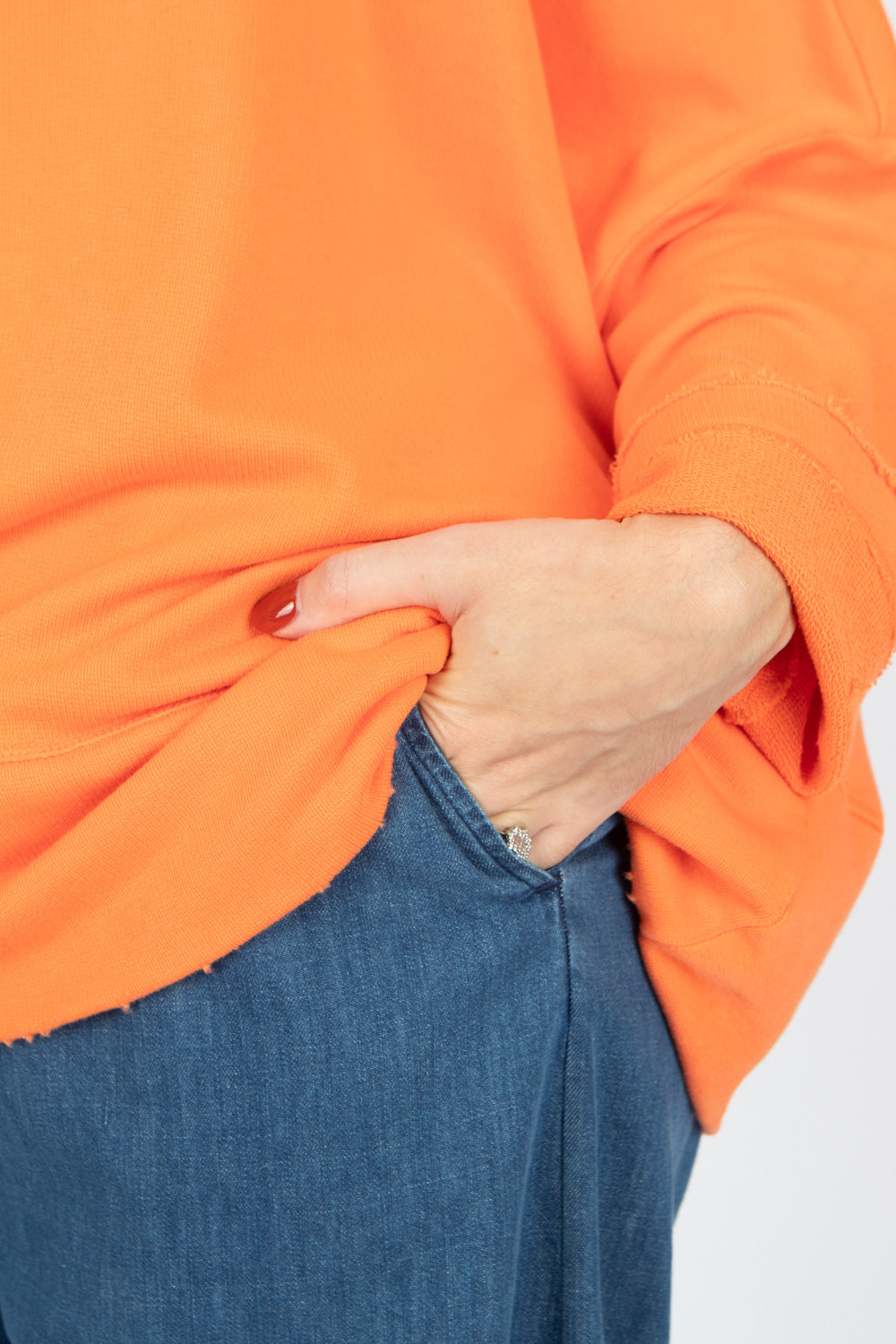 Raw edged double hem at the cuff and neck