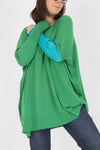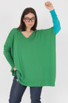 Are you tired of the same old boring jumpers? Do you crave a splash of colour in your life? Then look no further than our brand new Cashwool colour-block jumper! This one-size-fits-all wonder is crafted from the softest, cuddliest Cashwool you can imagine. It'll feel like wearing a hug! But that's not all! This jumper isn't afraid to stand out from the crowd. It features a bright, beautiful base colour that's sure to turn heads. But here's the twist: one sleeve is a completely different colour!
