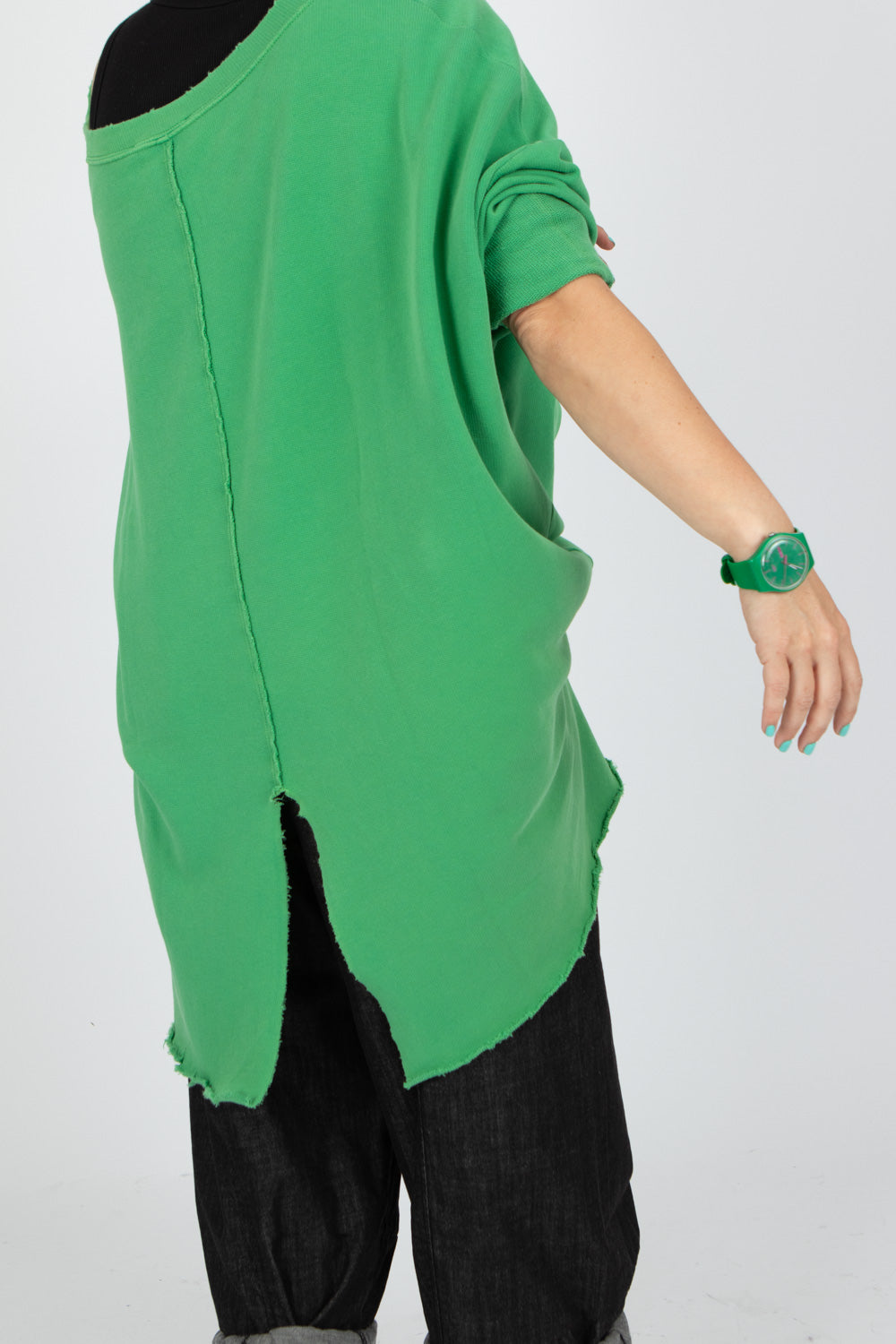 Designed with a relaxed, slightly oversized fit and a modern high-low hem. The raw edges and subtle distressed features, combined with a beautiful garment dye, create a truly high-end feel.