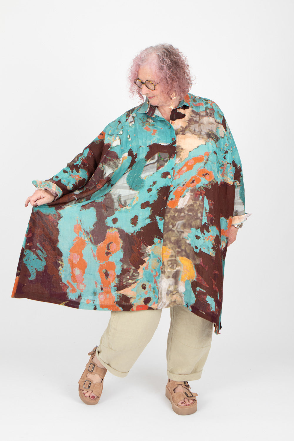 Style this paint linen shirt dress with neutral tones or pick out the pops of bright orange or yellow for a bolder look. Check out styling the shirt with the linen and jersey collections from Estudio Viva, the two brands style perfectly together.
